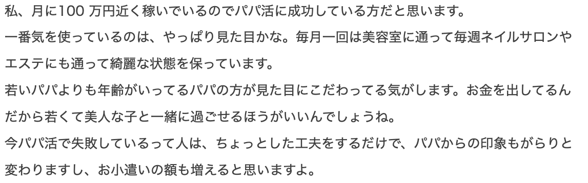 フレッシュで純粋な女子大生、マナーと常識があるOLが多いことを踏まえると、パパ活は若さだけでなく中身でも勝負できることがわかりますね。