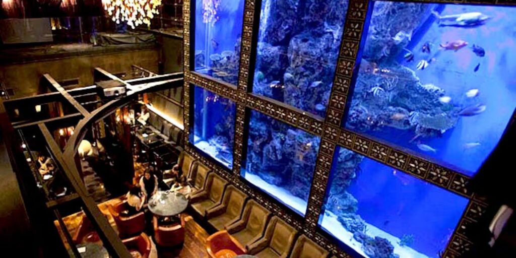 水槽を眺めながら食事を楽しめる幻想的な空間。非日常感があり、ムードを重視した大人デートに向いており、印象に残る時間を演出できます。